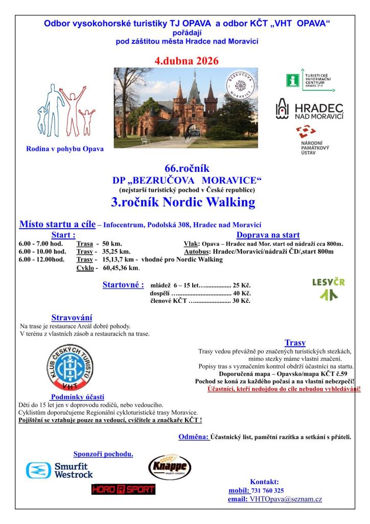 66. ročník nejstaršího turistického pochodu v ČR, start a cíl u Informačního centra Hradec nad Moravicí, se koná 4. dubna 2026. Vybírat můžete z pěších tras na 50, 35, 27, 15, 13 a 7 km. Cyklisté budou mít trasy navržené na 50 a 36 km.