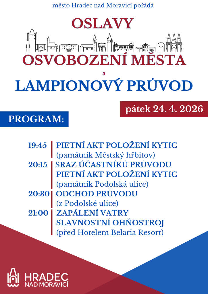 Oslavy osvobození města, kladení věnců u památníků na hřbitově, u Národního domu a Na Stránce a následný lampionový průvod za doprovodu Hradeckého dechového orchestru z Podolské ulice před Hotel Belaria, kde bude občerstvení a ohňostroj.