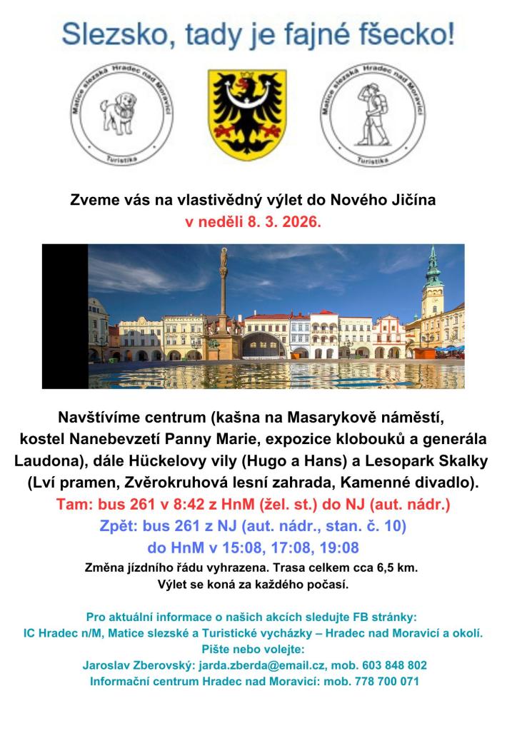 Turistický výlet do Nového Jičína. Návštěva kostelní věže, muzea klobouků a generála Laudona, lesoparku Skalka ( zvěrokruhové zahrady a kamenné divadlo), vily Huga Hückela a Hanze Hückela. Odjezd od aut. zast. žel. st. Hradec v 8.42 h. Vstupné se platí na místě.