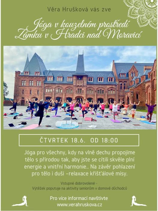 Věra Hrušková zve na cvičení jógy na nádvoří Červeného zámku. Vstupné je dobrovolné. Výtěžek poputuje na aktivity seniorům v domově důchodců. Pro více informací navštivte verahruskova.cz.