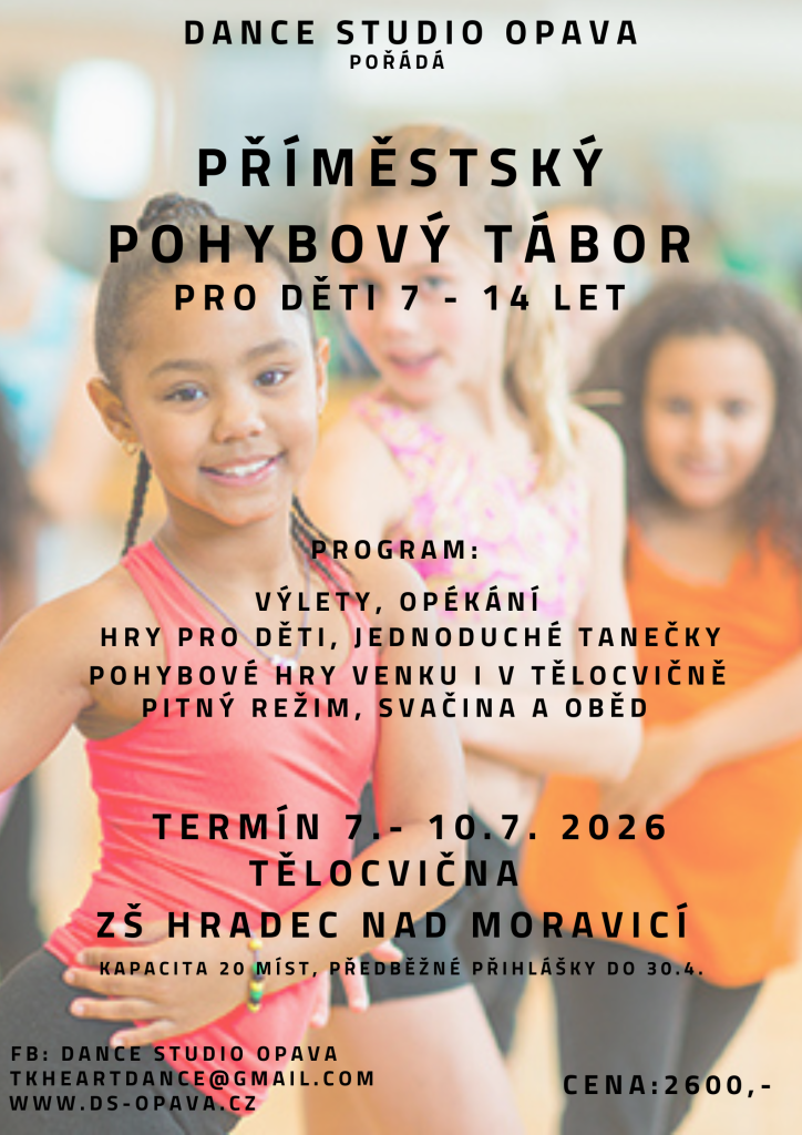 Dance Studio Opava pořádá příměstský pohybový tábor pro děti 7 - 14 let. Děti se mohou těšit na výlety, hry, jednoduché tanečky, zábava, pitný režim, svačina a oběd.