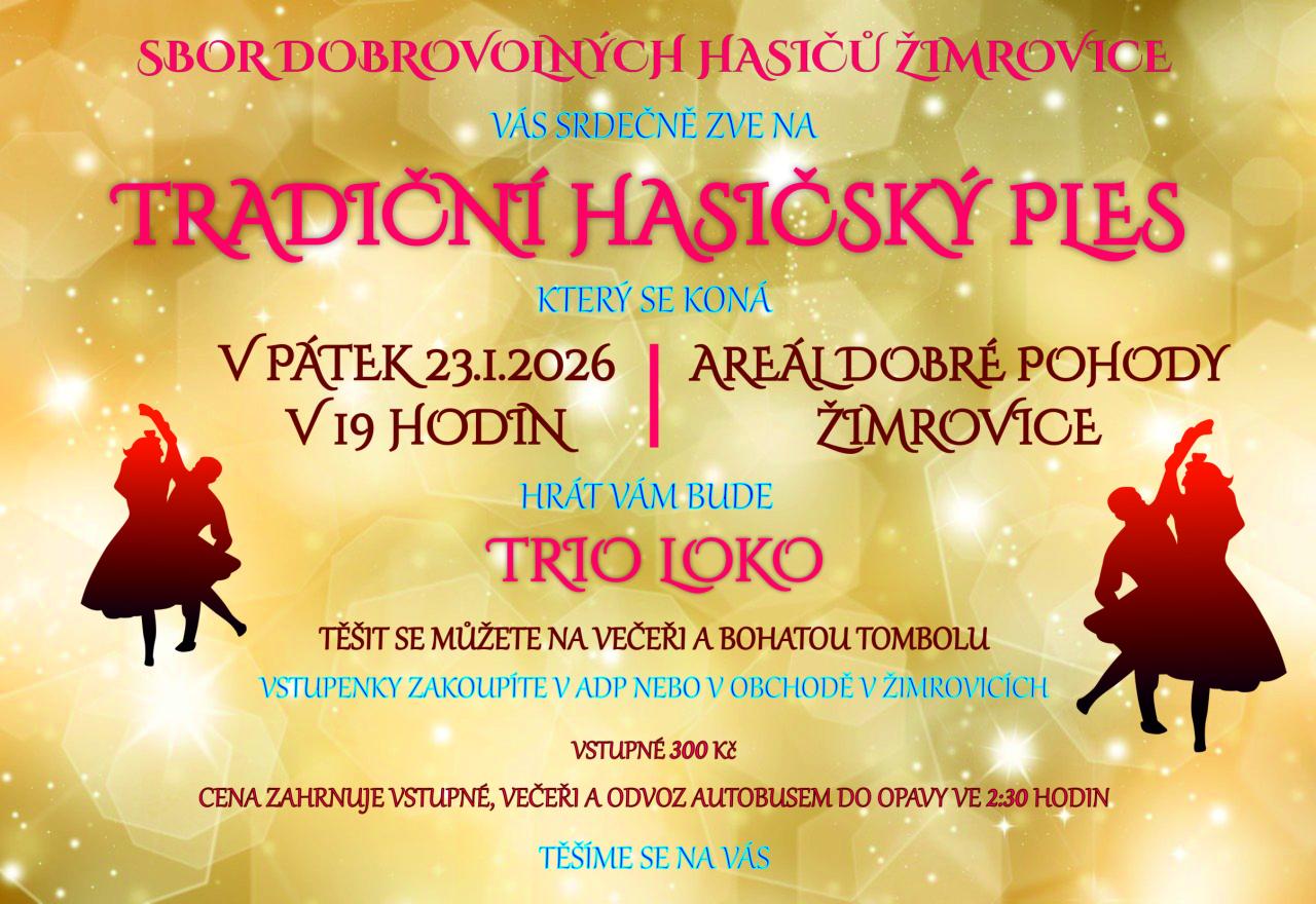 SDH Žimrovice srdečně zve na tradiční hasičský ples do Areálu Dobré Pohody. K tanci a poslechu zahraje kapela Trio Loko. Těšit se můžete na bohatou tombolu a večeři. Vstupenky zakoupíte v ADP nebo v obchodě v Žimrovicích. Zajištěn odvoz autobusem do Opavy ve 2:30 hodin.